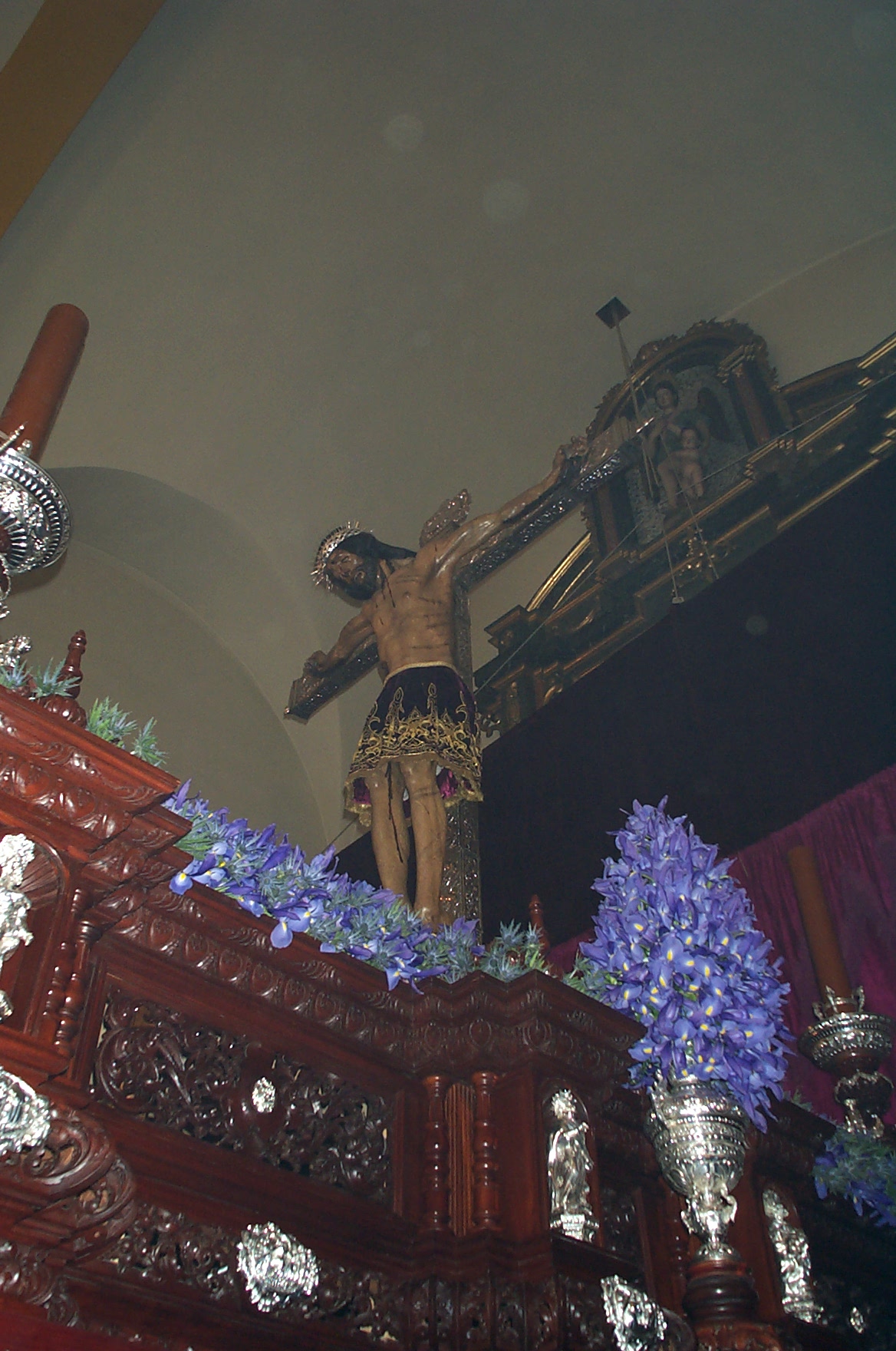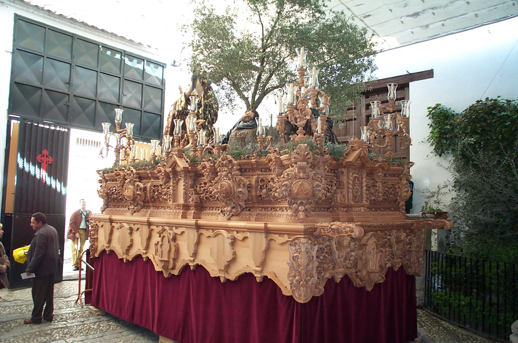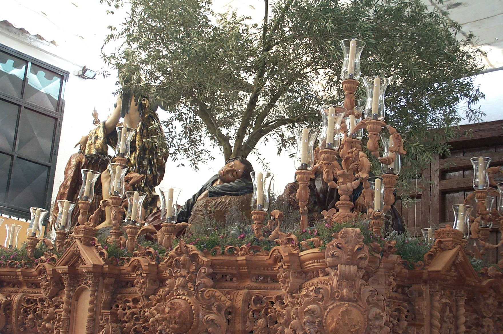 This is the name of one of the organizations that put on the processions.  The passo for this group is decorated with hand carved wood.  It is still in progress. This is the float that is decorated with hand carved wood.  The whole float is being carved by a now 67 year old craftsman from Seviila.  This is a closeup of the passo figures. This is a sample of the work being done by the craftsman on the float.