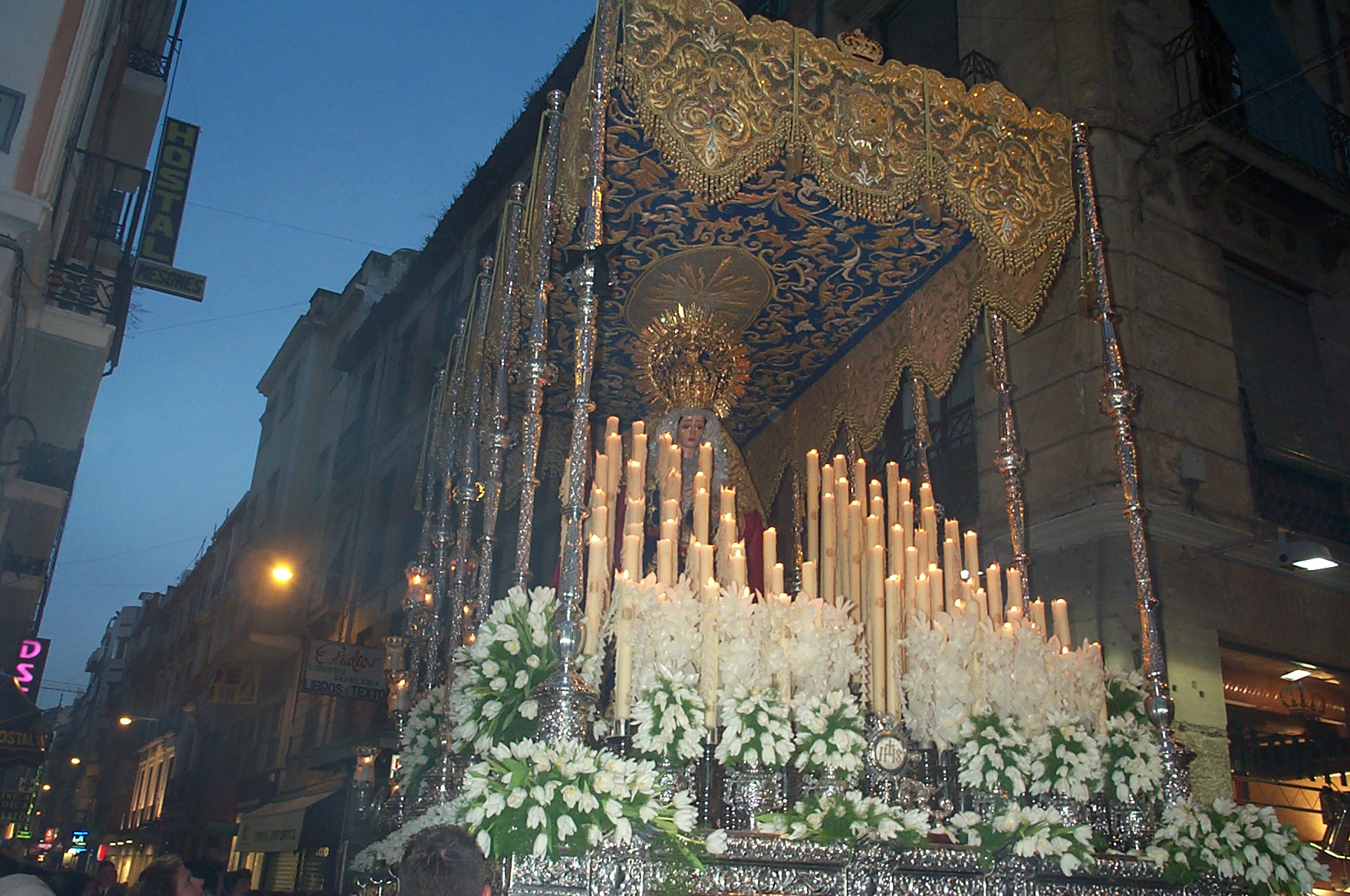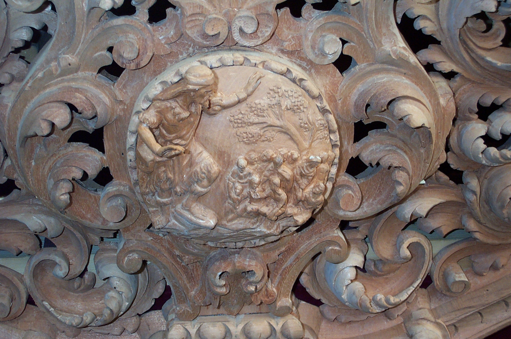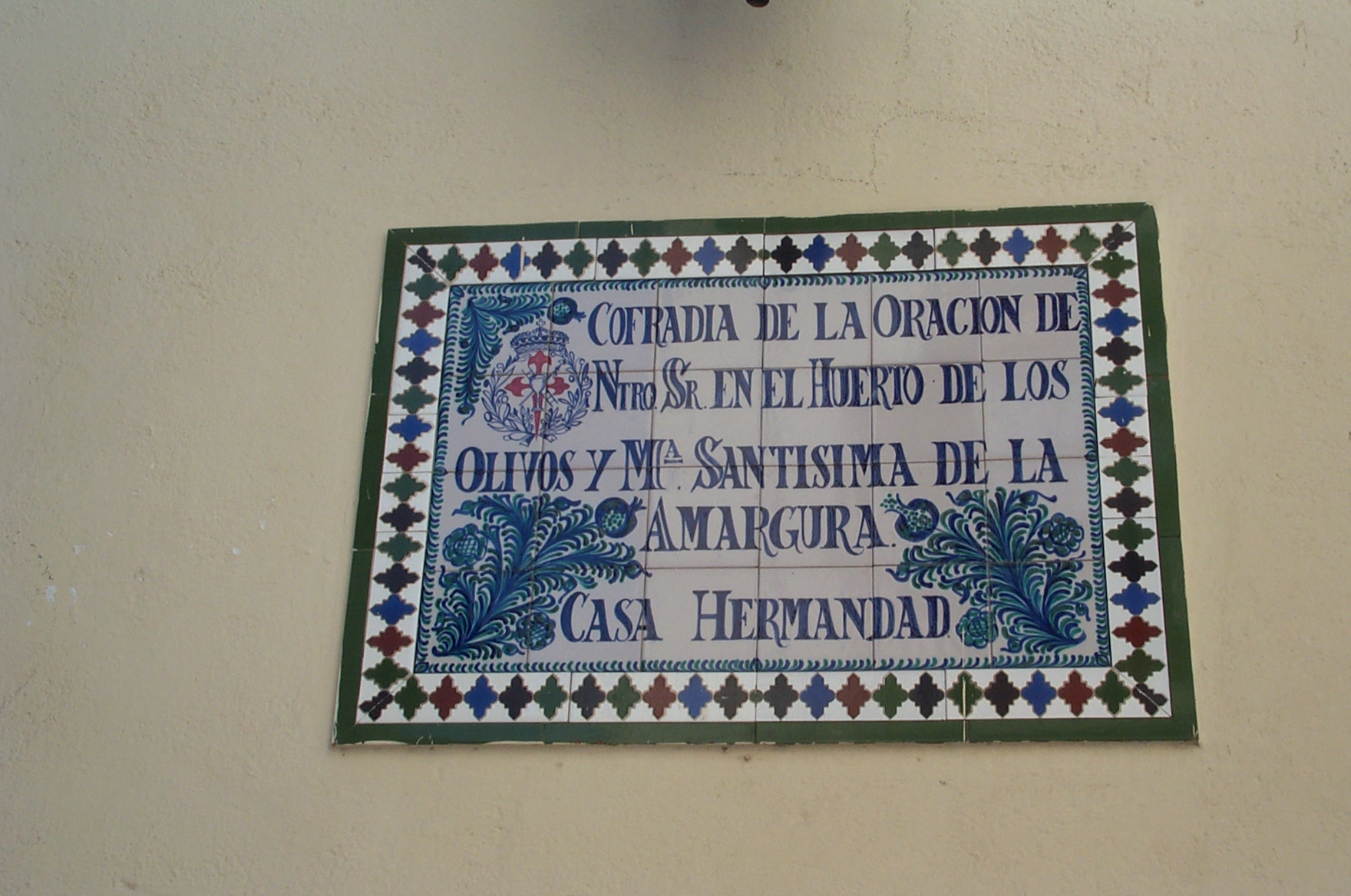 This is the name of one of the organizations that put on the processions.  The passo for this group is decorated with hand carved wood.  It is still in progress. This is the float that is decorated with hand carved wood.  The whole float is being carved by a now 67 year old craftsman from Seviila.  This is a closeup of the passo figures. This is a sample of the work being done by the craftsman on the float.