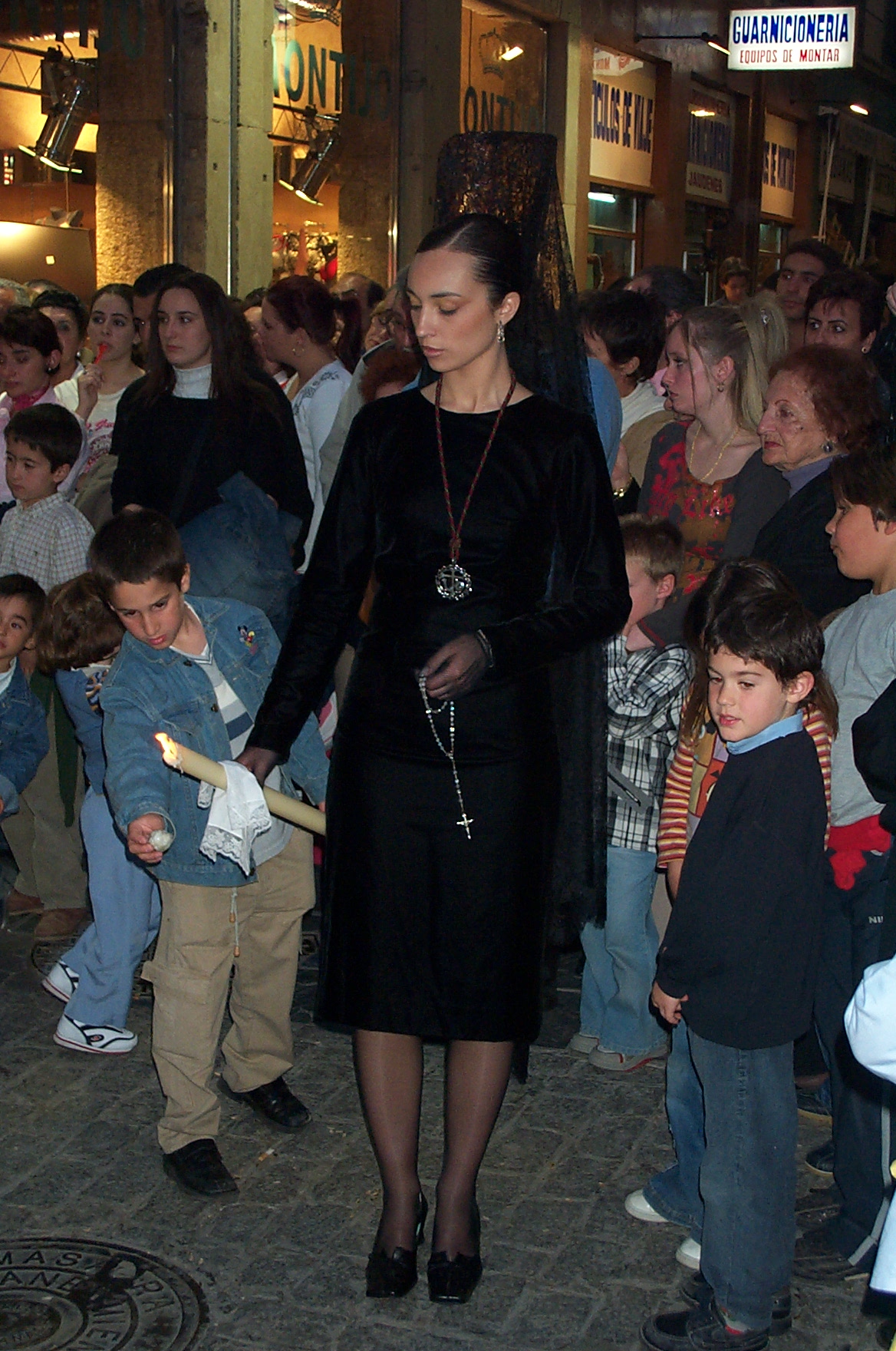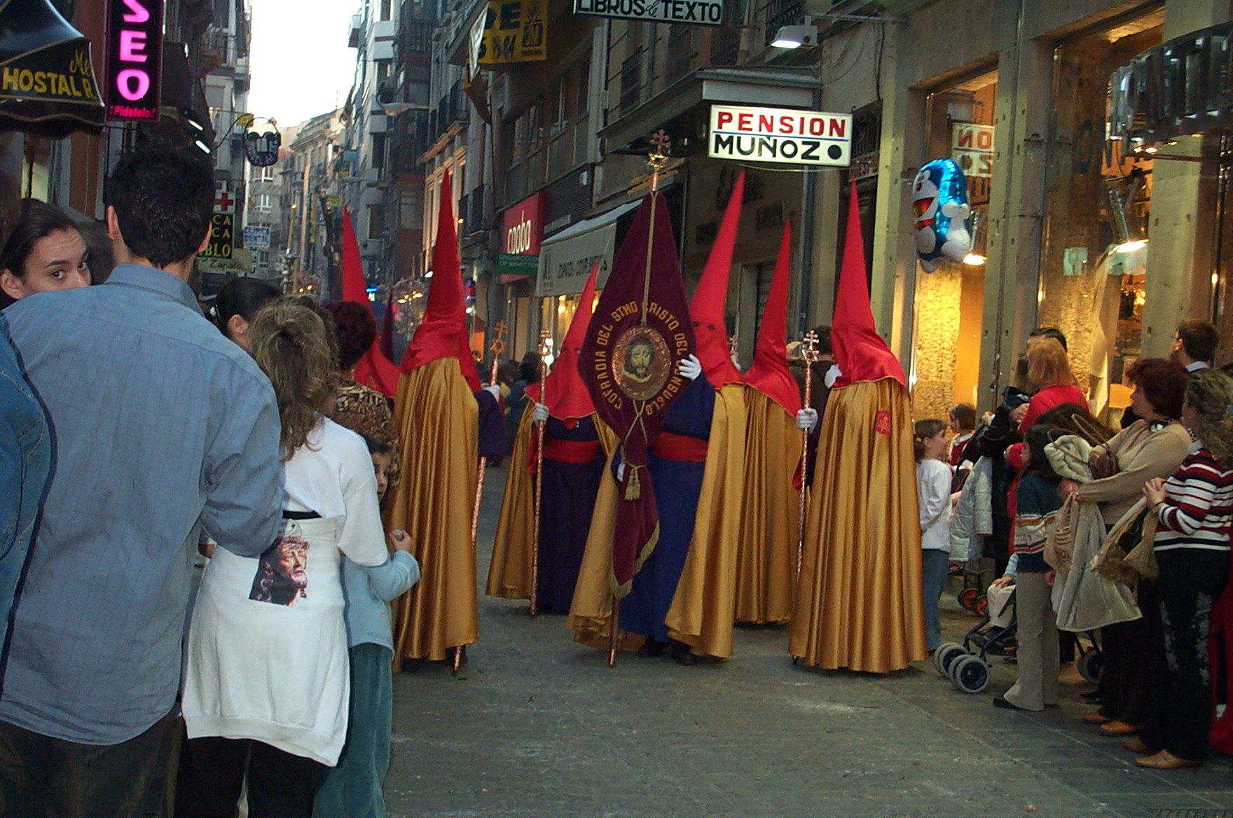 The colors kept on coming. She is Spanish.  There is nothing else to say.  She is the epitome of a Spanish woman.  She is dripping her wax on the boy's wax ball.  At the end of Semana Santa the child with the largest wax ball gets a prize from the city. The virgen from our second procession. This was the team change before entering the Cathedral.  Only the best passo bearers get to take it into the Cathedral.  The white headgear is how they carry the weight of the passo.